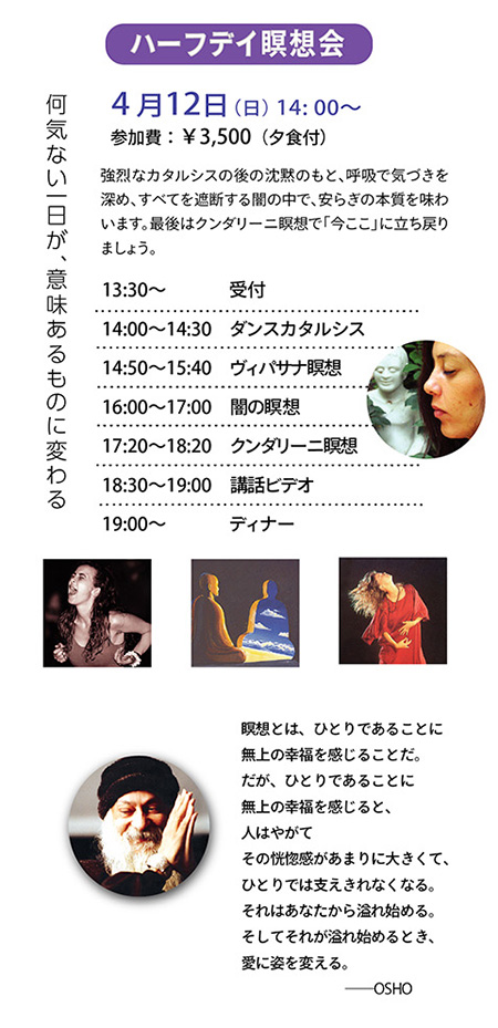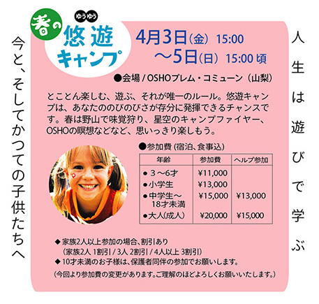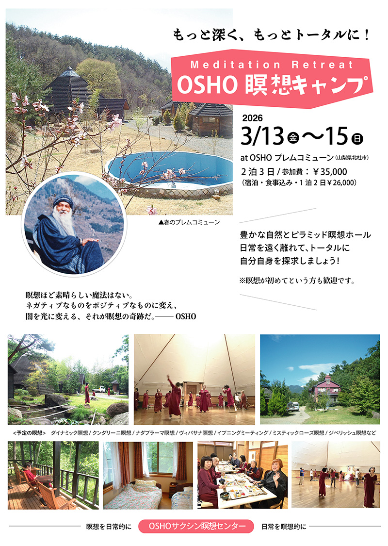 ◆ ◆ ◆ 2026年に贈る OSHO 言の葉 → こちら ■ヴィパサナ・リトリート 呼吸を見守る気づきの技法・ヴィパサナ瞑想をしましょう! 3月8日(日)13:30 〜 15:00 ■春のOSHO瞑想キャンプ 春の息吹に包まれて。もっと深く、もっとトータルに! 3月13日(金)夕方 〜 3月15日(日)夕方 より詳しいキャンプ情報は → こちら ■エンライトメントデイ・セレブレーション OSHOの光明と、あなたの光明を共に祝いましょう! 3月21日(土)食事付き 19:00 〜 21:00 ■OSHOの言葉にふれる会 こころに響くOSHOの言葉をシェアし合う、リラックスサロン 3月29日(日)15:30 〜 17:00 ■ 悠遊(ゆうゆう)キャンプ 4月3日(金)〜 4月5日(日)at プレム・コミューン 春の子どもキャンプで、若い自然と遊び戯れる! → 悠遊キャンプとは? ■ハーフデイ瞑想会 強烈なカタルシスから始め、闇の瞑想、クンダリーニ瞑想へと続きます。 4月12日(日)14:00 〜 19:00(夕食付)ご予約受付中! ■プレムコミューン瞑想の集い 山梨にあるOSHOプレムコミューンでのピラミッド瞑想会 4月19日(日)13:30 〜 17:30 参加費:¥3500(ヴィーガンスイーツ付き) *希望する方は食事もできます(要予約) 昼食 ¥1300 / 夕食 ¥1500 ◆◆◆ Special Program ■ テイスト・オブ・ミスティックローズ瞑想 3月8日(日)10:30〜12:00 ■ テイスト・オブ・ノーマインド瞑想 4月26日(日)10:30〜12:00 |