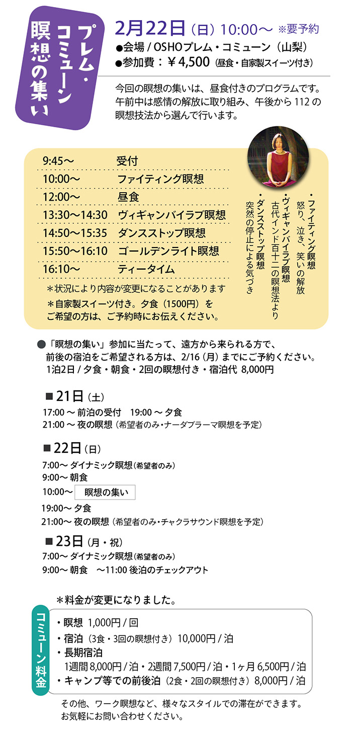 ◆ ◆ ◆ 2026年に贈る OSHO 言の葉 → こちら ■プレムコミューン瞑想の集い 山梨にあるプレムコミューンでの瞑想会 2月22日(日)10:00 〜 16:30 参加費:¥4500(昼食・自家製スイーツ付き) *希望する方は夕食(¥1500)もご用意できます。ご予約時にお伝えください。 「瞑想の集い」前後の宿泊を希望される方はこちらをご参照ください → こちら ■ヴィパサナ・リトリート 呼吸を見守る気づきの技法・ヴィパサナ瞑想をしましょう! 3月8日(日)13:30 〜 15:00 ■春のOSHO瞑想キャンプ 春の息吹に包まれて。もっと深く、もっとトータルに! 3月13日(金)夕方 〜 3月15日(日)夕方 ◆◆◆ Special Program ■ テイスト・オブ・ミスティックローズ瞑想 1月25日(日)10:30pm〜12:00pm ■ テイスト・オブ・ノーマインド瞑想 2月15日(日)10:30pm〜12:00pm |