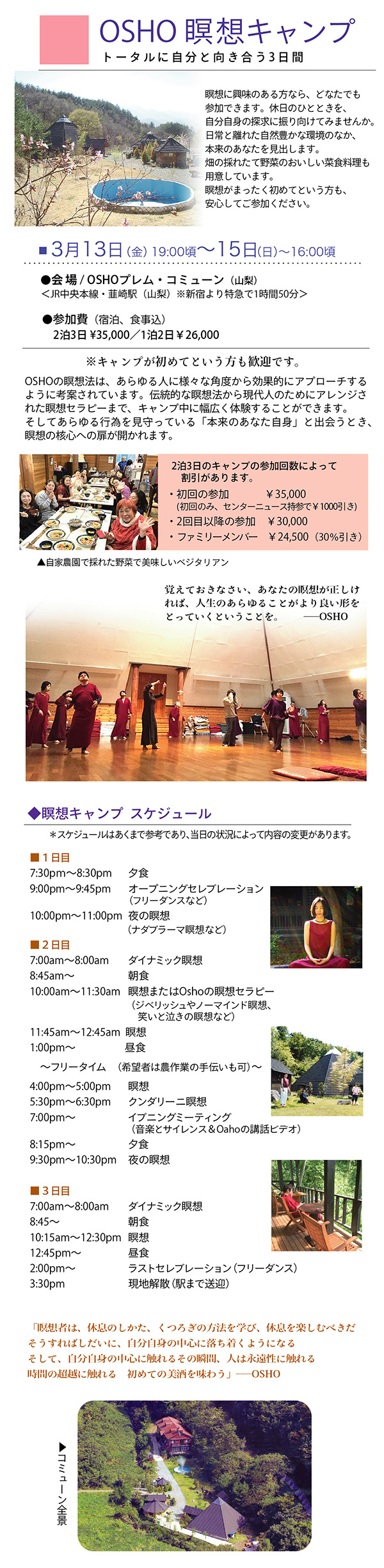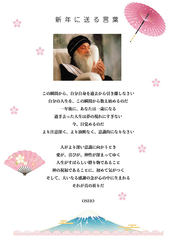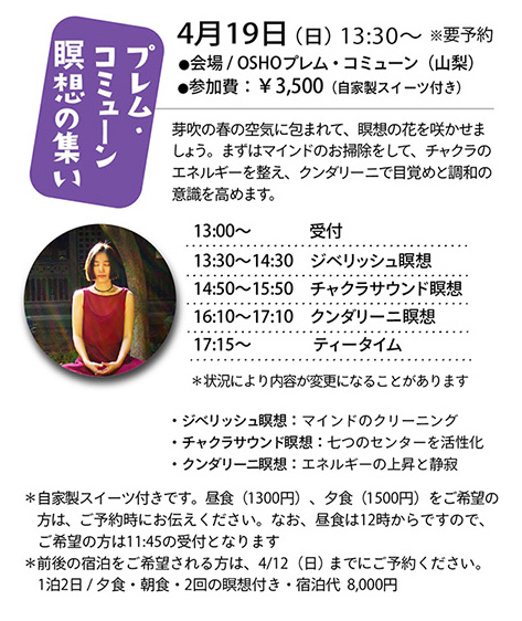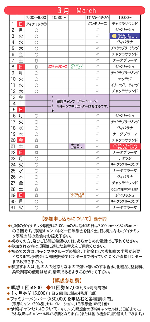 ◆ ◆ ◆ 2026年に贈る OSHO 言の葉 → こちら ■ヴィパサナ・リトリート 呼吸を見守る気づきの技法・ヴィパサナ瞑想をしましょう! 3月8日(日)13:30 〜 15:00 ■春のOSHO瞑想キャンプ 春の息吹に包まれて。もっと深く、もっとトータルに! 3月13日(金)夕方 〜 3月15日(日)夕方 より詳しいキャンプ情報は → こちら ■エンライトメントデイ・セレブレーション OSHOの光明と、あなたの光明を共に祝いましょう! 3月21日(土)食事付き 19:00 〜 21:00 ■OSHOの言葉にふれる会 こころに響くOSHOの言葉をシェアし合う、リラックスサロン 3月29日(日)15:30 〜 17:00 ■ 悠遊(ゆうゆう)キャンプ 4月3日(金)〜 4月5日(日)at プレム・コミューン 春の子どもキャンプで、若い自然と遊び戯れる! → 悠遊キャンプとは? ■ハーフデイ瞑想会 強烈なカタルシスから始め、闇の瞑想、クンダリーニ瞑想へと続きます。 4月12日(日)14:00 〜 19:00(夕食付)ご予約受付中! ■プレムコミューン瞑想の集い 山梨にあるOSHOプレムコミューンでのピラミッド瞑想会 4月19日(日)13:30 〜 17:30 参加費:¥3500(ヴィーガンスイーツ付き) *希望する方は食事もできます(要予約) 昼食 ¥1300 / 夕食 ¥1500 ◆◆◆ Special Program ■ テイスト・オブ・ミスティックローズ瞑想 3月8日(日)10:30〜12:00 ■ テイスト・オブ・ノーマインド瞑想 4月26日(日)10:30〜12:00 |