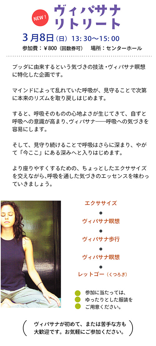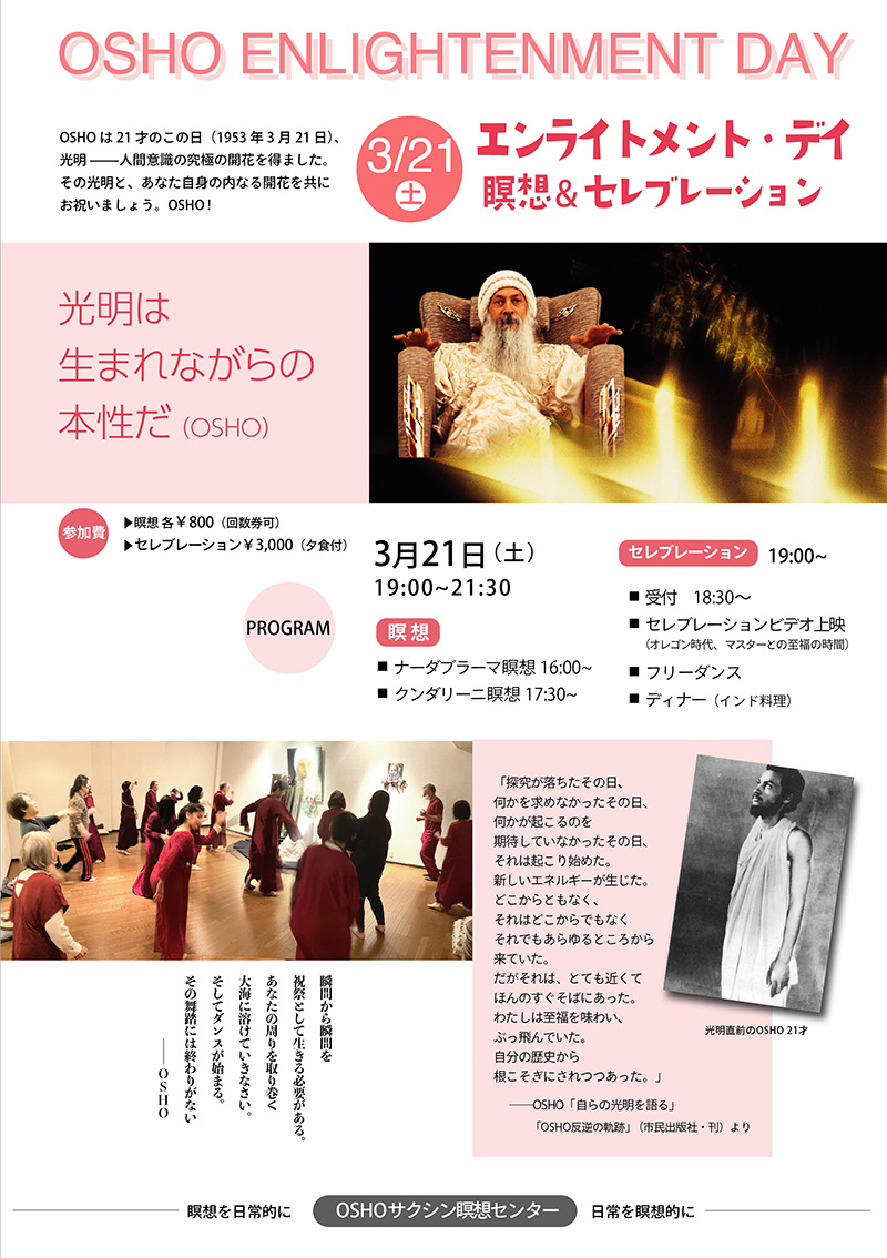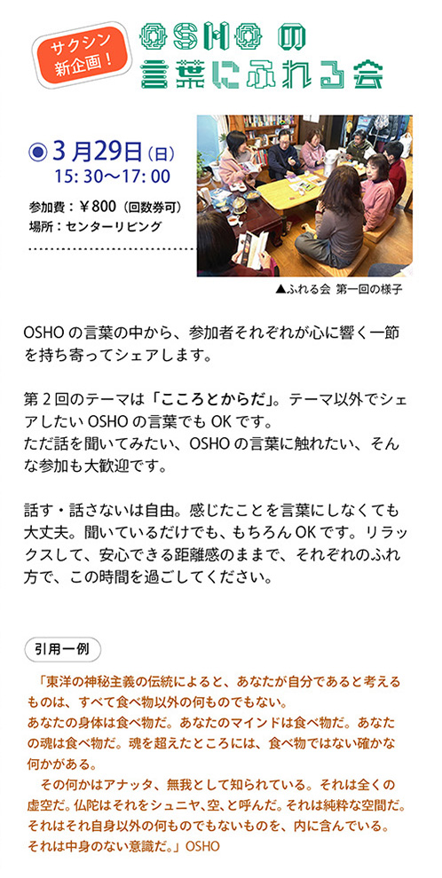 ■各イベントへの参加は、あらかじめお電話にてご予約をお願いします。 OSHOサクシン瞑想センター 03-5382-4734 Email Address : osho@sakshin.com ■ Last up date / March 7, 2026 |