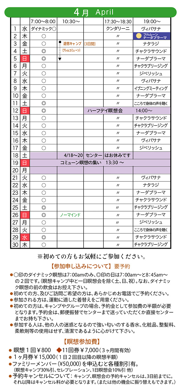 ■2026年3月と4月の瞑想スケジュールができました。 |